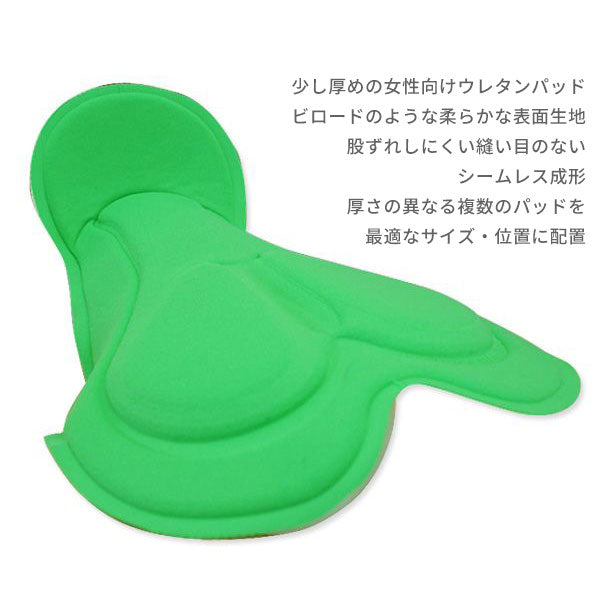 また、少し厚めの女性向けのビロードの様な柔らかな表面生地に、股ずれしにくい縫い目のないシームレス成形を施した、イタリア製のサイクル用パッドを採用。