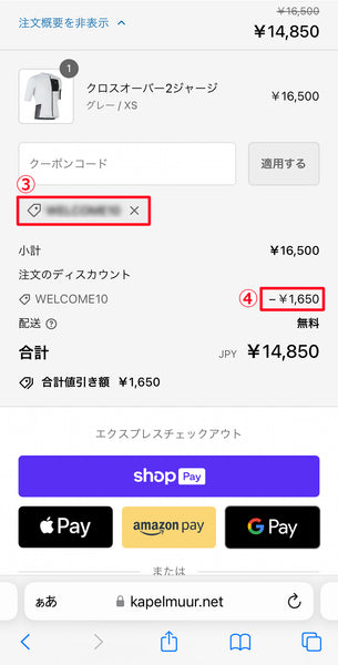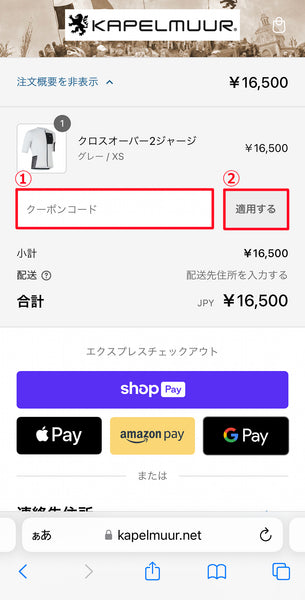 ①クーポンコードを枠内に入力し、②の「適用する」をクリックしてください。