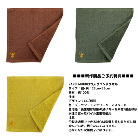 新作商品をご予約、または成約(内金)を頂いたお客様へ、非売品のKAPELMUURロゴ入りハンドタオルをプレゼント!